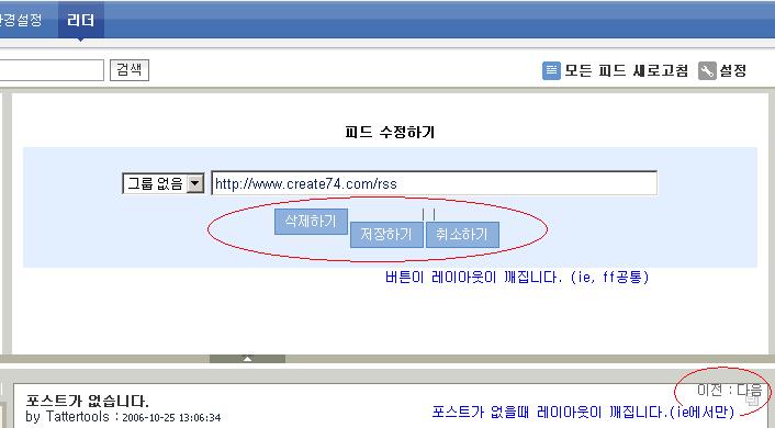 피드 수정할때 저장/삭제 버튼이 위치가 깨집니다. ie와 ff에서 같은현상입니다.